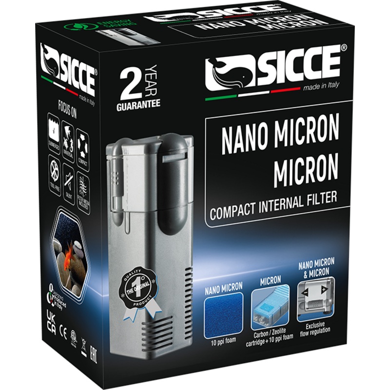 Sicce Nanomicron Internal Filter - 200L/H (10-75L Tank) - 4.5WNANO MICRON and MICRON are internal filters for starter kits, turtle kits and small aquariums. They are integrated with an antiwear device and an exclusive water flow control system which allows